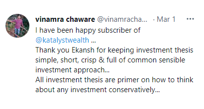 KatalystWealth.com (here in referred to as “Katalyst Wealth”) is the domain owned by Mittal Consulting (Ekansh Mittal is the Sole Proprietor). We offer independent equity research services to clients on subscription basis. SEBI (Research Analysts) Regulations 2014, Registration No. INH100001690, BSE Enlistment No. 5114.
