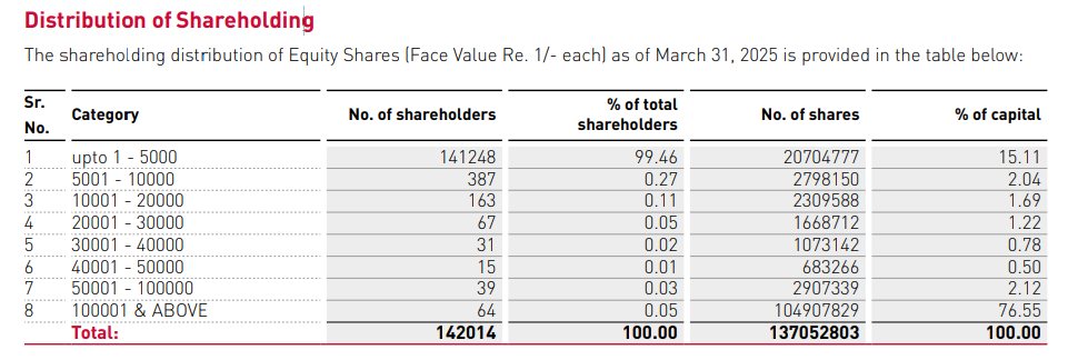 If we look at the shareholding distribution of the company as on 31st Mar’25, there were around 2 crore shares with the shareholders holding shares in the range of 1-5,000.